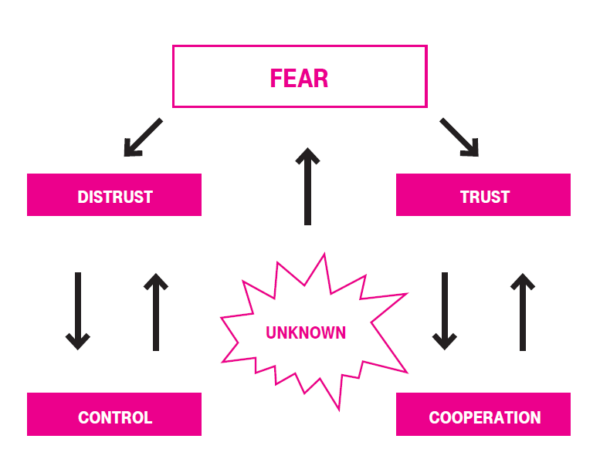 Wenn wir mit dem Unbekannten konfrontiert werden – was in einem dynamischen Umfeld zunehmend der Fall ist – reagieren wir zunächst mit Unsicherheit oder Angst. In einer solchen Situation können wir Vertrauen oder Misstrauen schenken. Im Falle von Misstrauen überprüfen wir in kurzen Abständen, ob das erwartete Verhalten eingetreten ist. Im Falle von Vertrauen gehen wir vom Auftreten von Verhalten aus. Der Akt des Vertrauens fördert die Offenheit und die Zusammenarbeit in einer Beziehung. Vertrauen ist ein evolutionärer Mechanismus, der uns kognitiv entlastet. Wir müssen nicht mehr jede Beziehung auf den Prüfstand stellen. Vertrauen vereinfacht die Komplexität der sozialen Beziehungen, ohne dass das eigene Risiko zu groß wird.