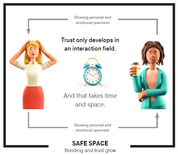 Mit Gegenseitigkeit ist es leichter, Vertrauen aufzubauen. Das heißt, wenn jemand ein Risiko eingeht, will er, dass auch die andere Seite ein Risiko eingeht. Dies muss jedoch nicht dasselbe Risiko sein, weder in zeitlicher noch in wertmäßiger Hinsicht. Um ein psychologisch sicheres Umfeld in Interaktionen zu schaffen, wird Vertrauen aufgebaut, indem man sich explizit oder implizit an vereinbarte Regeln und Normen hält (z. B. was im Raum gesagt wird, bleibt im Raum) und persönliche und emotionale Offenheit zeigt. Studien zeigen, dass die Offenlegung von emotionalen und persönlichen Informationen anderen gegenüber Nähe und Vertrauen fördern kann.