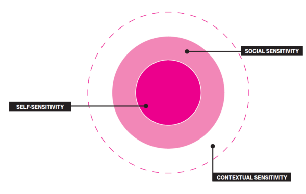 … ist die Fähigkeit, die Gefühle, Gedanken und Erfahrungen des anderen (entweder in der Vergangenheit oder in der Gegenwart) zu verstehen, sich ihrer bewusst zu sein und sie stellvertretend mitzuerleben, ohne dass sie auf objektiv explizite Weise vollständig mitgeteilt werden. Außerdem sollte man die Auswirkungen des eigenen Handelns auf andere erkennen (z. B. wenn ein Kollege sich konzentrieren muss und sich bewusst ist, dass eine laute Diskussion im selben Raum stören kann, und deshalb in einen anderen Raum geht). Soziale Sensibilität bezieht sich auf andere und fördert die Zugehörigkeit, wenn sich der Einzelne bei der Arbeit mit anderen verbunden fühlt. Zur Akzeptanz gehören die Wertschätzung der Mitarbeiter, die Integration und die Vielfalt.