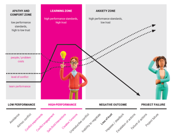 Auf einem Spektrum – von wenig Spannung bis zu viel Spannung in einem Team – lassen sich der Leistungsanspruch und das notwendige Maß an Vertrauen gut darstellen. Wenn es im Team keine oder nur geringe Spannungen gibt, werden Konflikte vermieden oder impulsive Ad-hoc-Konflikte, die vielleicht schon lange unter der Oberfläche gegärt haben. In dieser Apathie und Komfortzone erbringt das Team schlechte Leistungen und hat ein geringes Konfliktniveau. Mit einem hohen Maß an Vertrauen können Spannungen genutzt werden, um bessere Ergebnisse zu erzielen. Kreative Spannung – zum Beispiel das Nebeneinanderstellen verschiedener Perspektiven – kann zu neuen Erkenntnissen führen. In einem sicheren Umfeld wird nach den Ursachen von Fehlern gesucht und nicht nach den Schuldigen, um aus ihnen zu lernen. In Teams mit hohen Spannungen und wenig Vertrauen kommt es zu unproduktiven Konflikten, Handlungsunfähigkeit oder gar Vertrauensverlust. Projekte können in eine Situation manövriert werden, aus der man nicht mehr herauskommt, bis hin zum Scheitern des Projekts oder einzelner Aktionen. In dieser Angstzone nimmt die Teamleistung ab und die Kosten für Probleme steigen. Nur Vertrauen ermöglicht Spitzenleistungen, denn nur hier kann ein hoher Leistungsstandard bei gleichzeitiger Nachhaltigkeit gewährleistet werden.